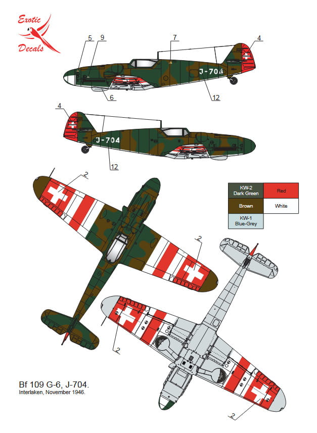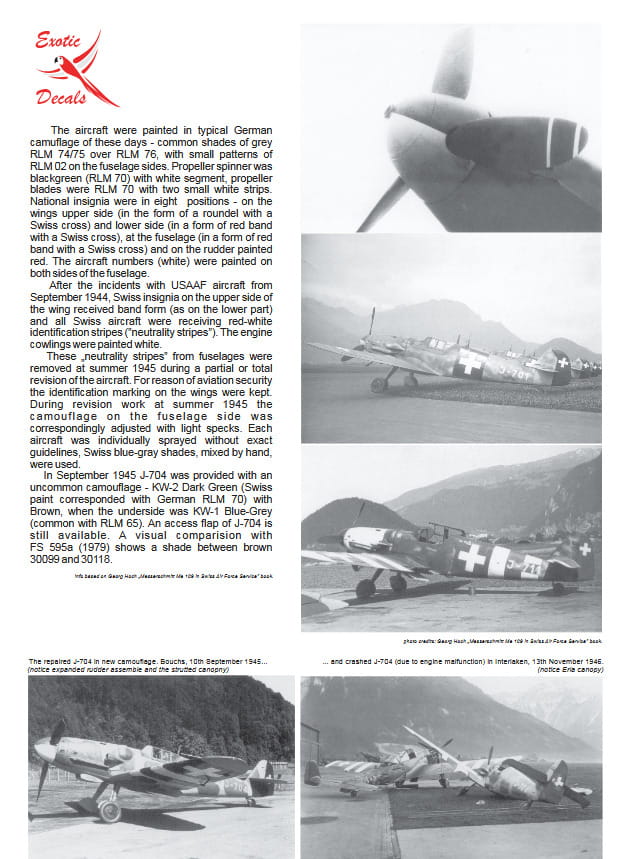 - Kalkomanie do trzech egzemplarzy Bf 109G-6 w szwajcarskich barwach