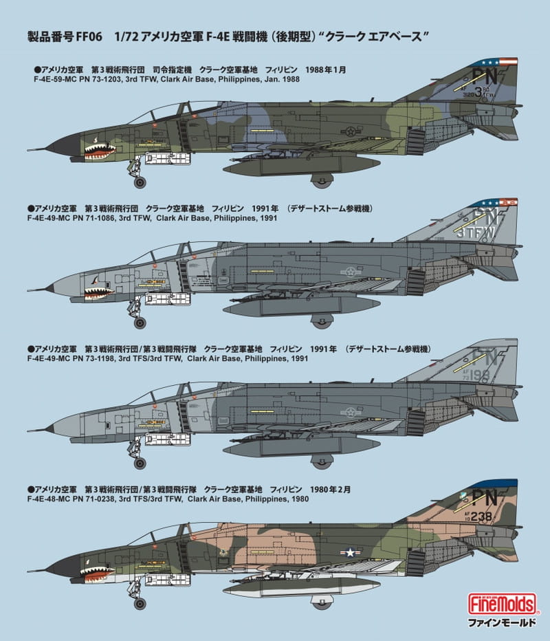 F-4E Phantom II to jedna z najbardziej rozpoznawalnych konstrukcji odrzutowych okresu zimnej wojny. Dwusilnikowy, dwumiejscowy myśliwiec wielozadaniowy służył w siłach powietrznych Stanów Zjednoczonych oraz wielu państw sojuszniczych. Zestaw Fine Molds w skali 1:72 przedstawia późną wersję F-4E w malowaniu USAF z bazy Clark Air Base, która przez lata była ważnym punktem amerykańskiej obecności wojskowej na Dalekim Wschodzie.