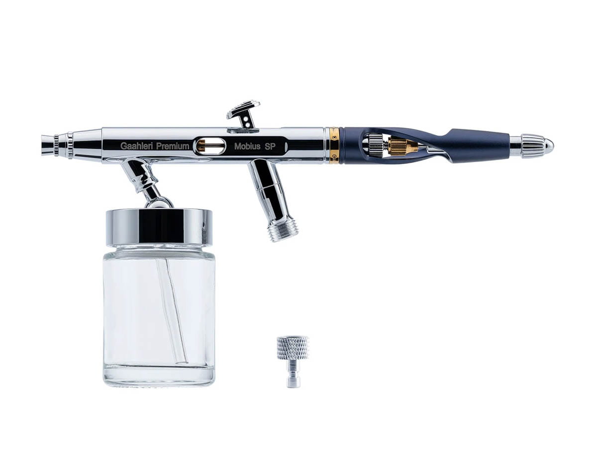 Gaahleri GHPM Mobius SP Premium Series to zaawansowany aerograf syfonowy zaprojektowany z myślą o twórcach oczekujących zarówno wysokiej precyzji, jak i wydajnego natrysku na większych powierzchniach. Wyposażony w dwa wymienne zestawy dysza–iglica (0,3 mm oraz 0,5 mm), pozwala płynnie przechodzić od cienkich linii do szerokiego pokrycia farbą.