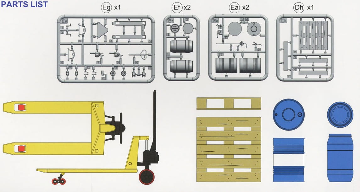 Zestaw plastikowy do sklejania zawierający wózek paletowy wraz z paletami i beczkami.