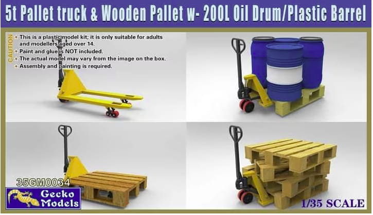 Gecko Models 35GM0034 - 1:35 5t Pallet Truck & Wooden Pallet w-200L Oil Drum/Plastic Barrel