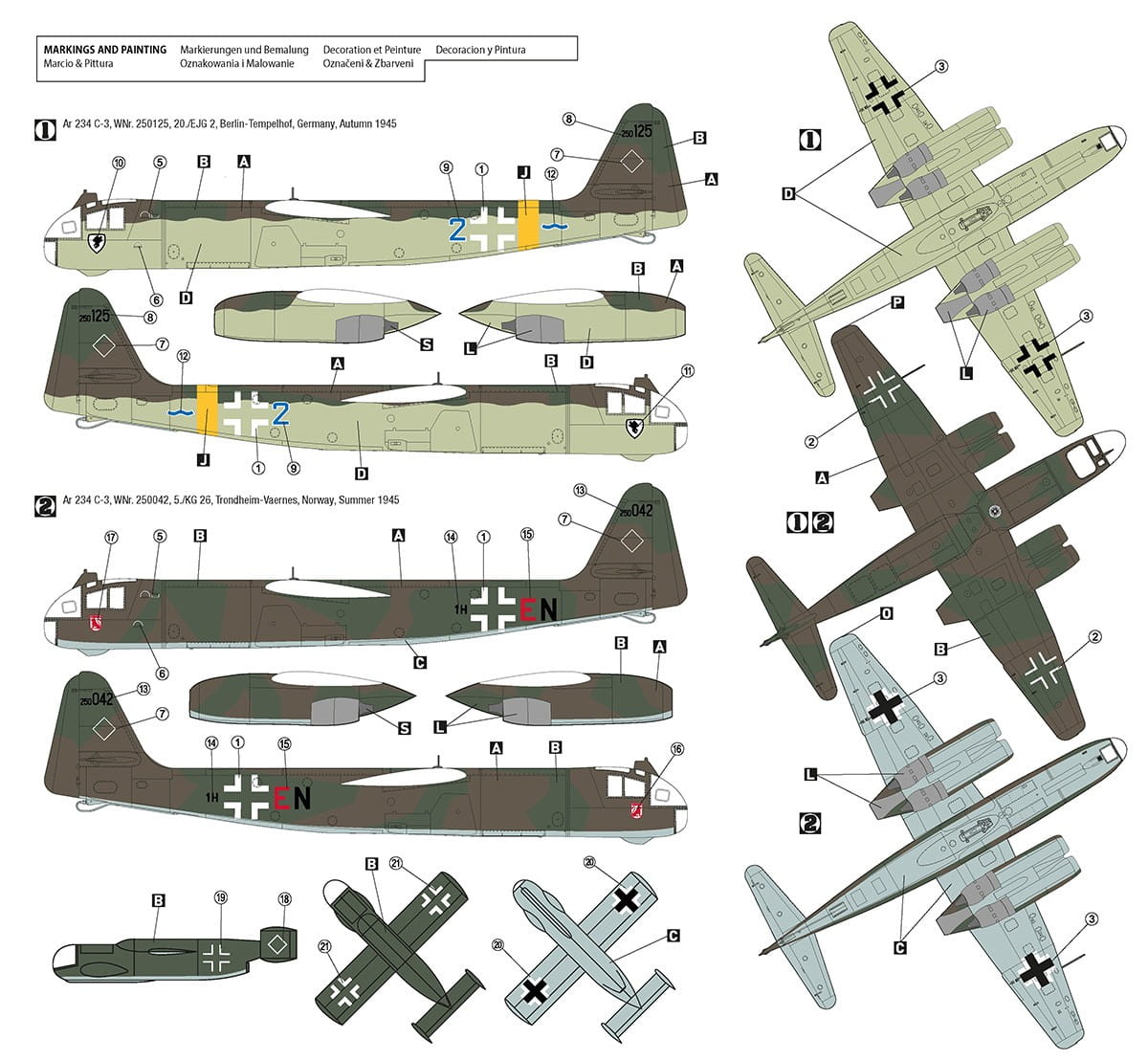 Plastikowy model do sklejania niemieckiego samolotu bombowo-rozpoznawczego Arado Ar 234 C-3. Wersja z myśliwcem Ar E381 Julia.