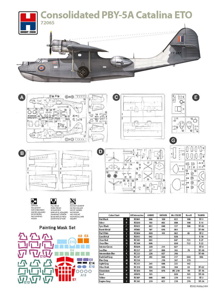 Model plastikowy do sklejania amerykańskiego samolotu amfibii Consolidated PBY-5A Catalina. Części plastikowe firmy Academy, kalkomanie Cartograf, opakowanie, opracowanie instrukcji i kalkomanii Hobby 2000. Model zawiera maski do malowania kabin i kół. Zestaw kalkomanii dla 3 samolotów używanych w Europie podczas drugiej wojny światowej.