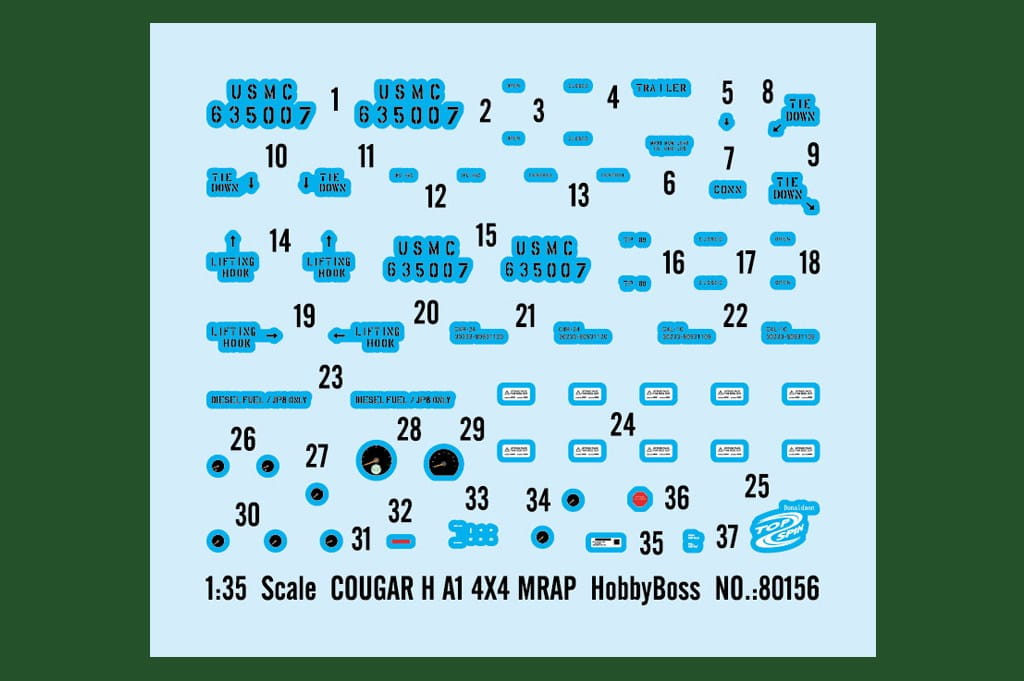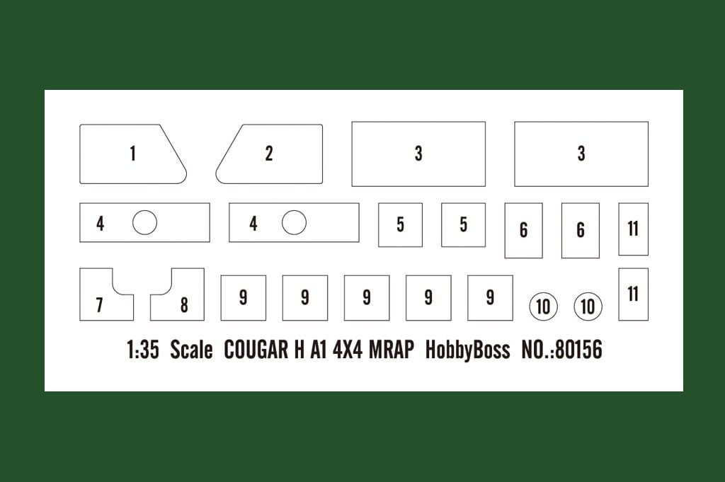 Model firmy Hobby Boss przedstawia nowoczesny pojazd Cougar H A1 4×4 MRAP – jeden z najczęściej używanych przez amerykańskie siły zbrojne pojazdów o zwiększonej odporności na wybuchy min i improwizowanych ładunków (MRAP – Mine Resistant Ambush Protected). Pojazdy tej klasy stały się symbolem działań wojsk NATO w Iraku i Afganistanie, dzięki swojej wytrzymałości i skutecznej ochronie załogi.