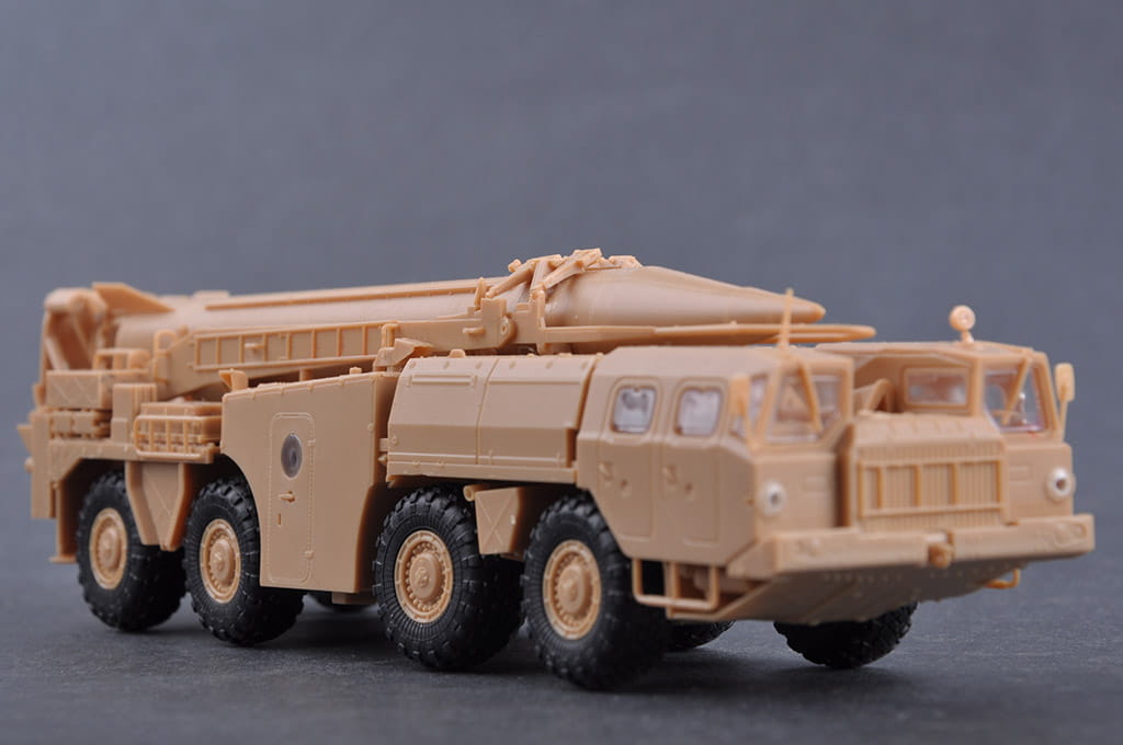 Model plastikowy do sklejania rosyjskiej wyrzutni pocisków balistycznych 9P117M1 z rakietami Scud B.