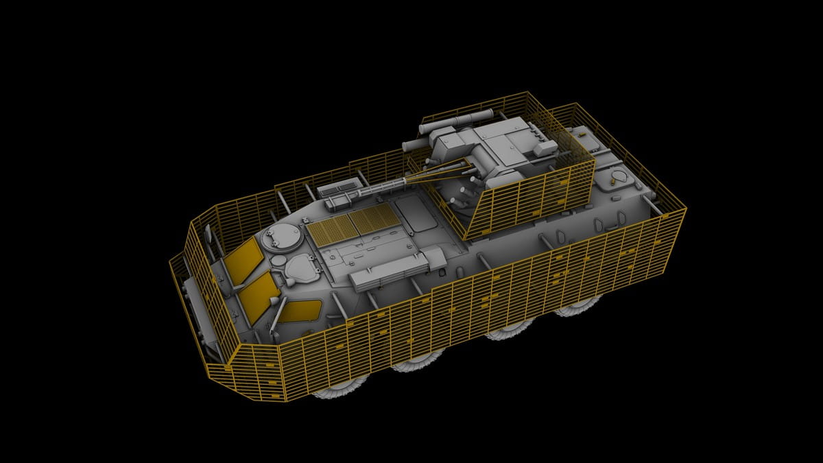 Model plastikowy do sklejania ukraińskiego transportera opancerzonego BTR-4E z klatkowym dopancerzeniem.