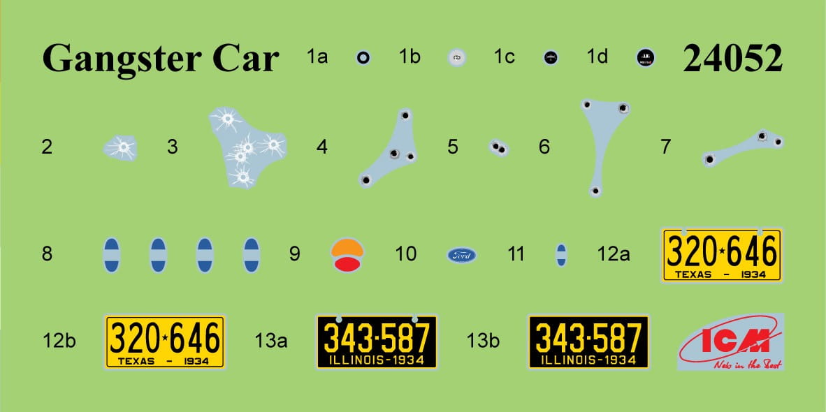 Zestaw składa się z plastikowych elementów o wysokiej precyzji wykonania, umożliwiających złożenie pełnej repliki Forda Model A z epoki międzywojennej. Odwzorowane są m.in. wnętrze kabiny, detale deski rozdzielczej i silnika. Zestaw nie zawiera elementów uzbrojenia, ale stylistyka pojazdu oddaje klimat amerykańskich lat 30. – doskonały do dioram z epoki prohibicji lub jako baza pod własne przeróbki.