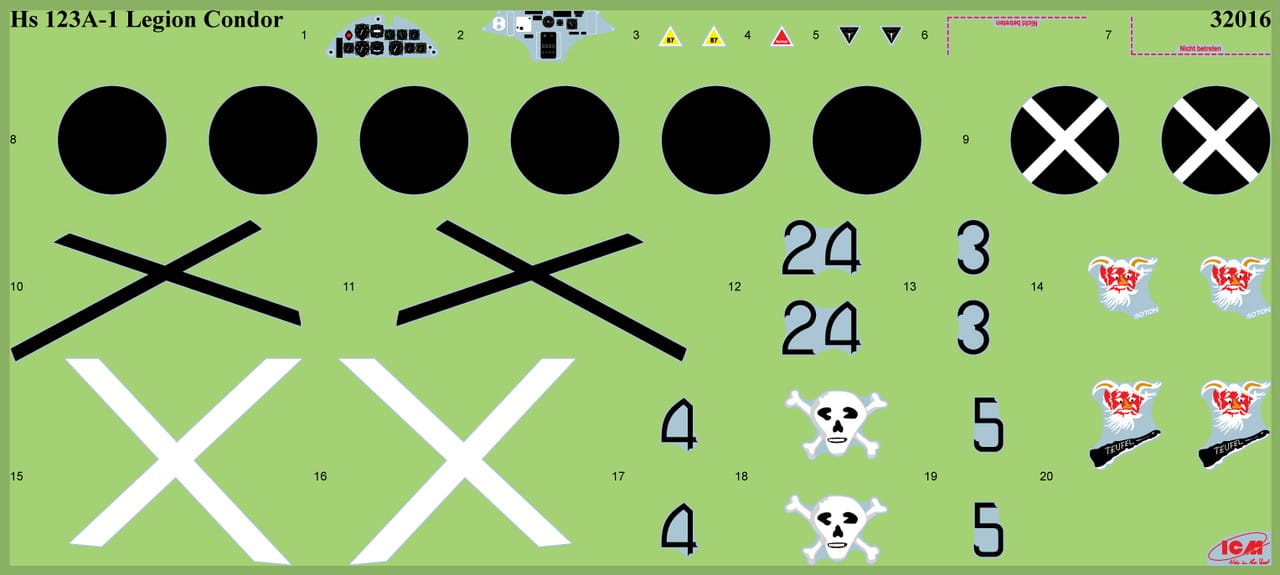 ICM 32016 to szczegółowy model w skali 1:32 przedstawiający samolot szturmowy Henschel Hs 123A-1 używany przez niemiecki Legion Condor podczas wojny domowej w Hiszpanii. Zestaw umożliwia odwzorowanie maszyny z jednostki VJ/88, uczestniczącej w walkach w rejonie Malagi i innych frontach konfliktu.