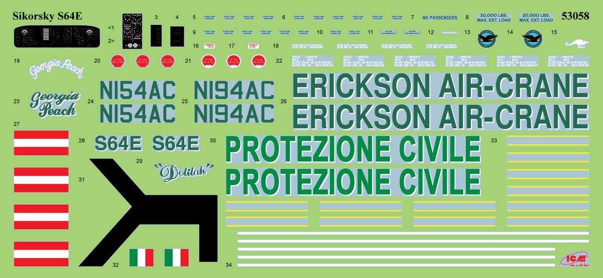 Zestaw ICM 53058 przedstawia w skali 1:35 amerykański ciężki śmigłowiec transportowy S-64E Skycrane, opracowany przez firmę Sikorsky i rozwijany przez Erickson. Maszyna wyróżnia się nietypową sylwetką z otwartą belką ogonową i mocnym podwoziem, umożliwiającym podnoszenie i przenoszenie ładunków zewnętrznych o dużej masie. Skycrane znalazł zastosowanie w transporcie wojskowym, cywilnym i ratowniczym, m.in. przy gaszeniu pożarów lasów.