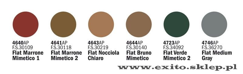 Zestaw farb akrylowych (6 x 20ml) : - Flat Marrone Mimetico 1 - Flat Marrone Mimetico 2 - Flat Nocciola Chiaro - Flat Bruno Mimetico - Flat Verde Mimetico 2 - Flat Medium Gray