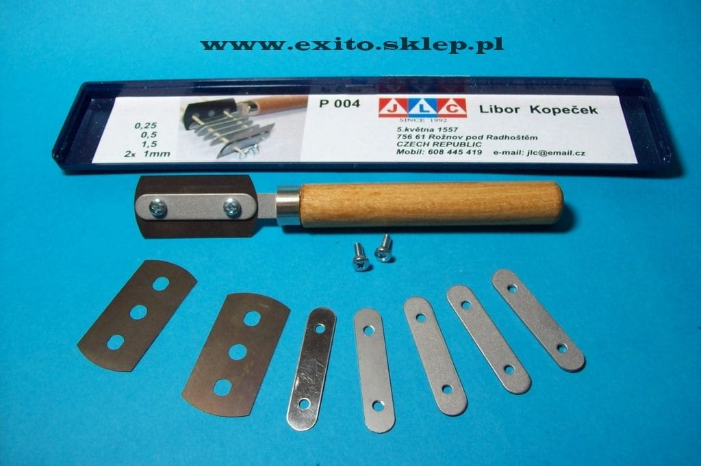 Piłka modelarska o kształcie żyletki, znane i popularne wśród modelarzy narzędzie (tzw. czeska żyletka) do cięcia elementów plastikowych i żywicznych. Zestaw o rozszerzonej zawartości. W opakowaniu trzy ostrza , każde o dwóch rozmiarach zębów, uchwyt i zestaw przekładek, który umożliwia zamocowanie dwóch piłek JLC na jednym uchwycie i precyzyjne cięcie równoległe. Można stosować pojedyncze przekładki lub ich kombinacje co pozwala uzyskać wiele rozmiarów szerokości cięcia. 5 szt. przekładek : 1,5mm - 2 x 1,0mm - 0,5mm - 0,25mm