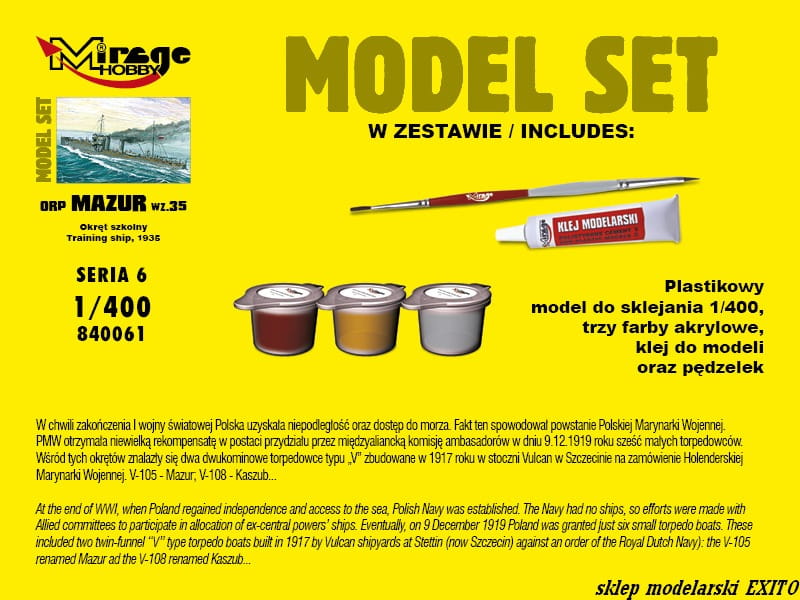 MIRAGE 840061 - 1:400 ORP Mazur 1935 Okręt Szkolny - Model Set