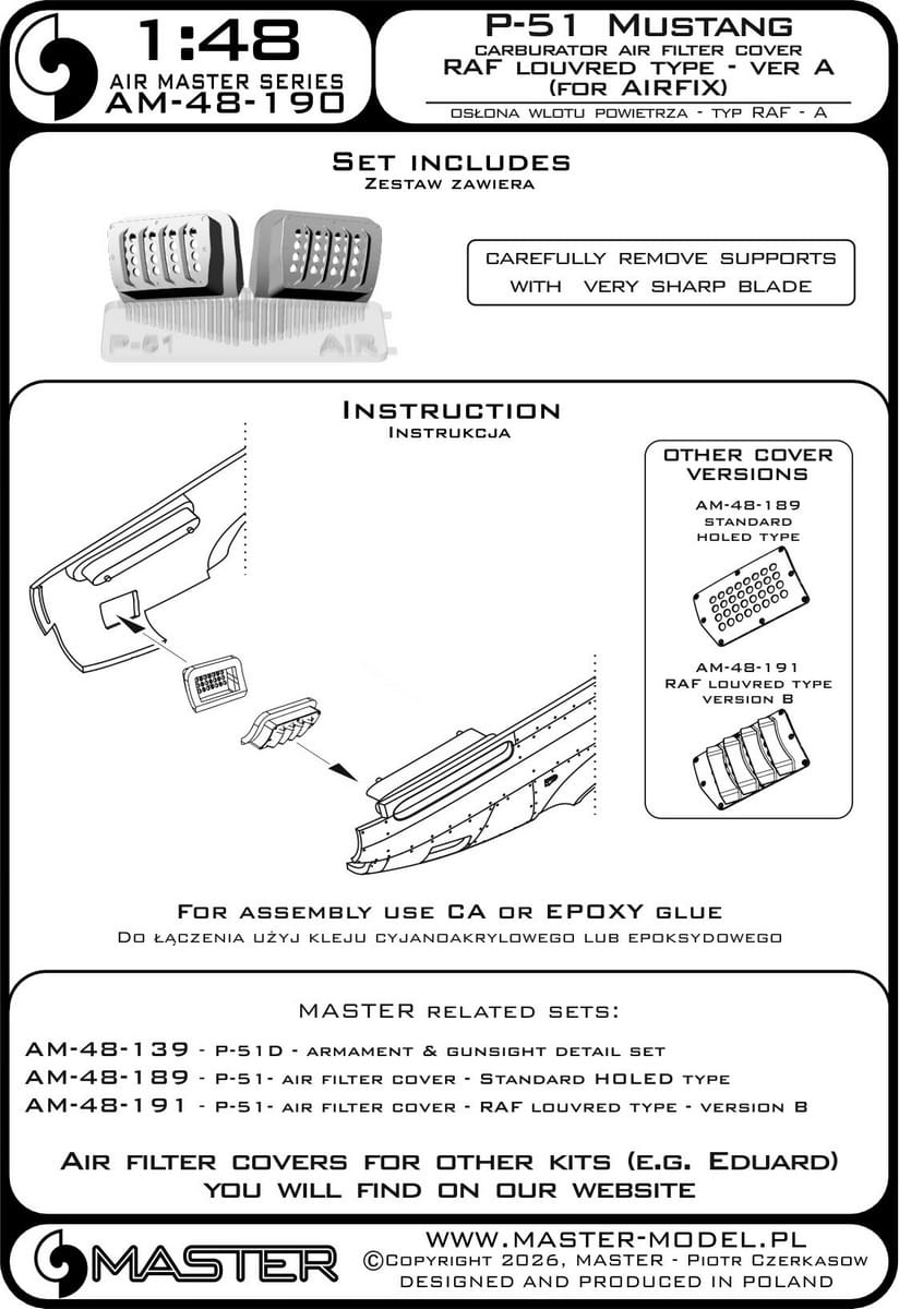 Zestaw Master Model AM-48-190 zawiera precyzyjnie wykonany element pokrywy wlotu powietrza do gaźnika przeznaczony do modelu P-51 Mustang w wersji używanej przez RAF. Element odwzorowuje charakterystyczny wariant z żaluzjami i został zaprojektowany do modeli firmy Airfix w skali 1:48.