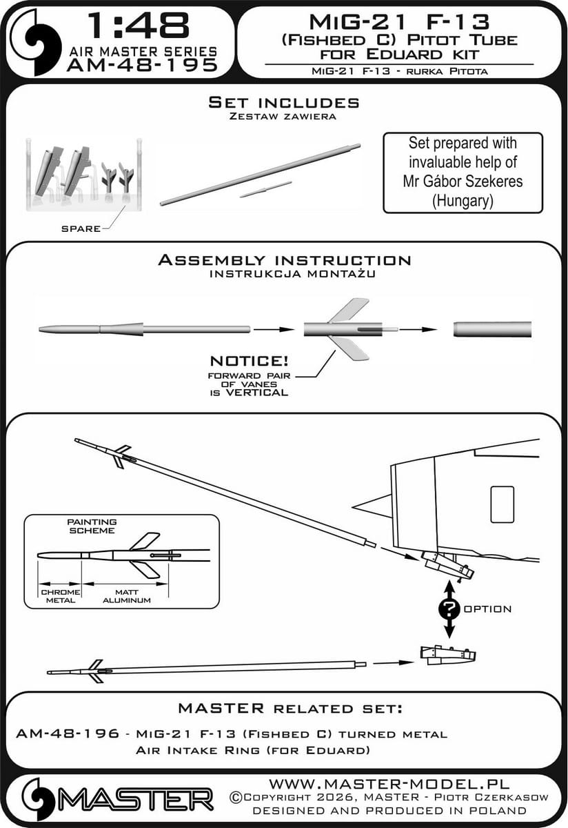 Zestaw Master Model AM-48-195 zawiera precyzyjnie wykonaną rurkę Pitota przeznaczoną do modelu samolotu MiG-21 F-13 w skali 1:48. Element wykonany z mosiądzu w połączeniu z detalami z żywicy drukowanej w technologii 3D zapewnia bardzo wysoki poziom odwzorowania i realizmu.