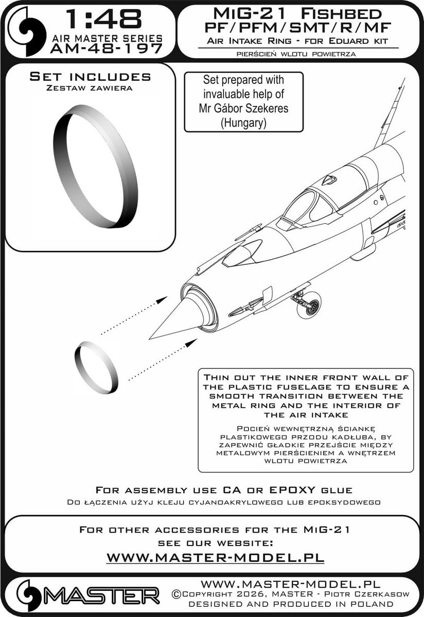 Zestaw Master Model AM-48-197 zawiera precyzyjnie wykonany pierścień wlotu powietrza przeznaczony do modeli samolotu MiG-21 w wersjach PF, PFM, SMT, R oraz MF w skali 1:48. Element wykonany z aluminium zapewnia bardzo wysoką jakość powierzchni oraz realistyczny wygląd charakterystycznego wlotu powietrza tego myśliwca.