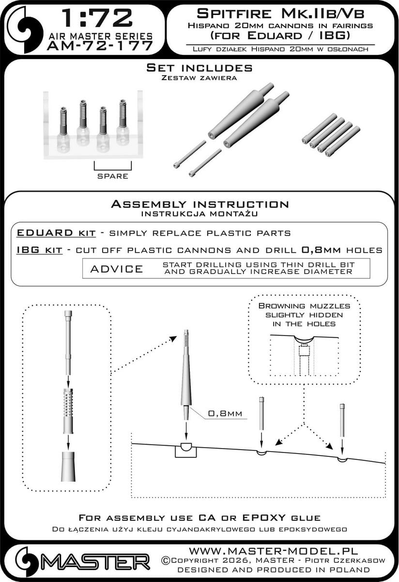 Zestaw Master Model AM-72-177 zawiera precyzyjnie wykonane lufy uzbrojenia przeznaczone do modeli samolotu Supermarine Spitfire Mk.IIb oraz Mk.Vb w skali 1:72. W komplecie znajdują się lufy działek Hispano 20 mm wraz z osłonami oraz końcówki luf karabinów maszynowych Browning .303.