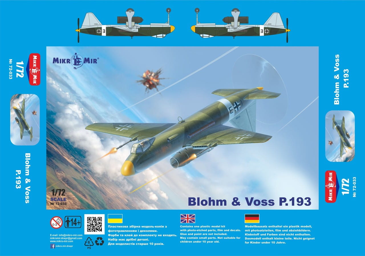 Zestaw Mikromir 72-033 przedstawia jeden z mniej znanych, lecz niezwykle interesujących projektów niemieckiej konstrukcji – Blohm & Voss P.193. Był to projekt bombowca nurkującego/uderzeniowego opracowany w połowie 1944 roku, który nigdy nie został zrealizowany w formie prototypu. Projekt przewidywał m.in. silnik Junkers Jumo 213A o mocy ok. 1 780 KM.