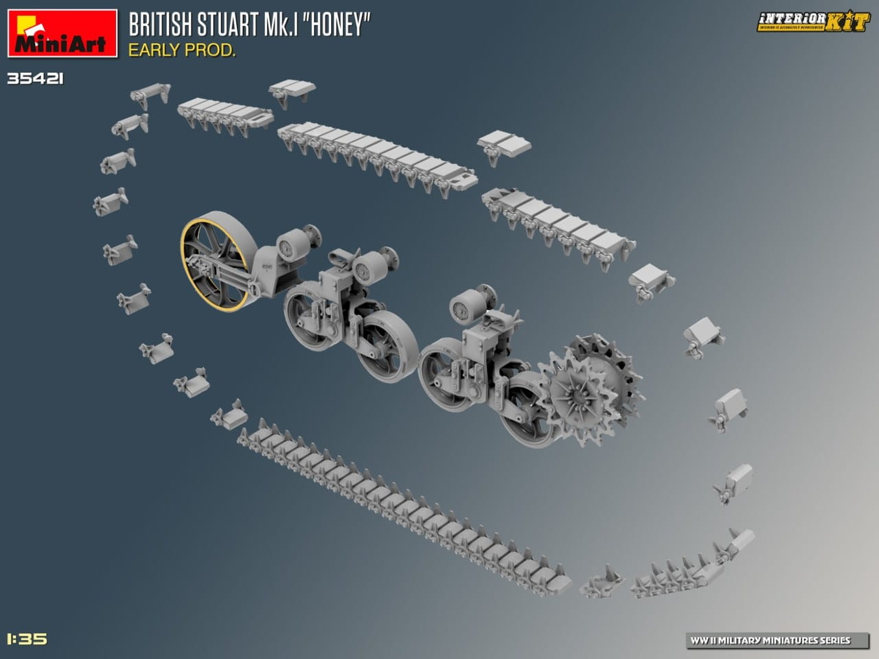 Model plastikowy do sklejania amerykańskiego czołgu lekkiego Stuart Mk.I Honey wczesnej produkcji z możliwością wykonania pełnego wnętrza pojazdu.