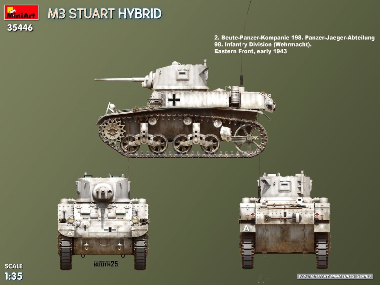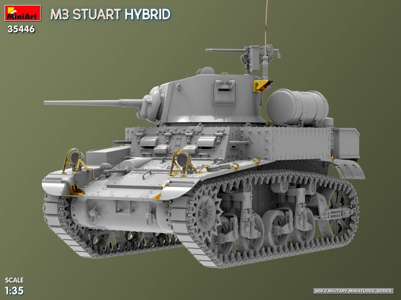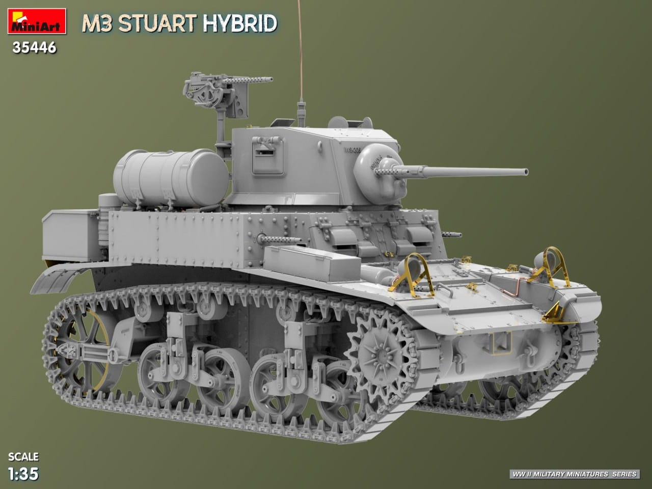 MiniArt 35446 to szczegółowy model plastikowy w skali 1:35 przedstawiający amerykański lekki czołg M3 Stuart w wersji Hybrid. Odmiana ta łączyła elementy kadłuba wykonane w różnych technologiach – nitowanej oraz spawanej – co było charakterystyczne dla wczesnego okresu produkcji i przejściowej fazy rozwoju konstrukcji.