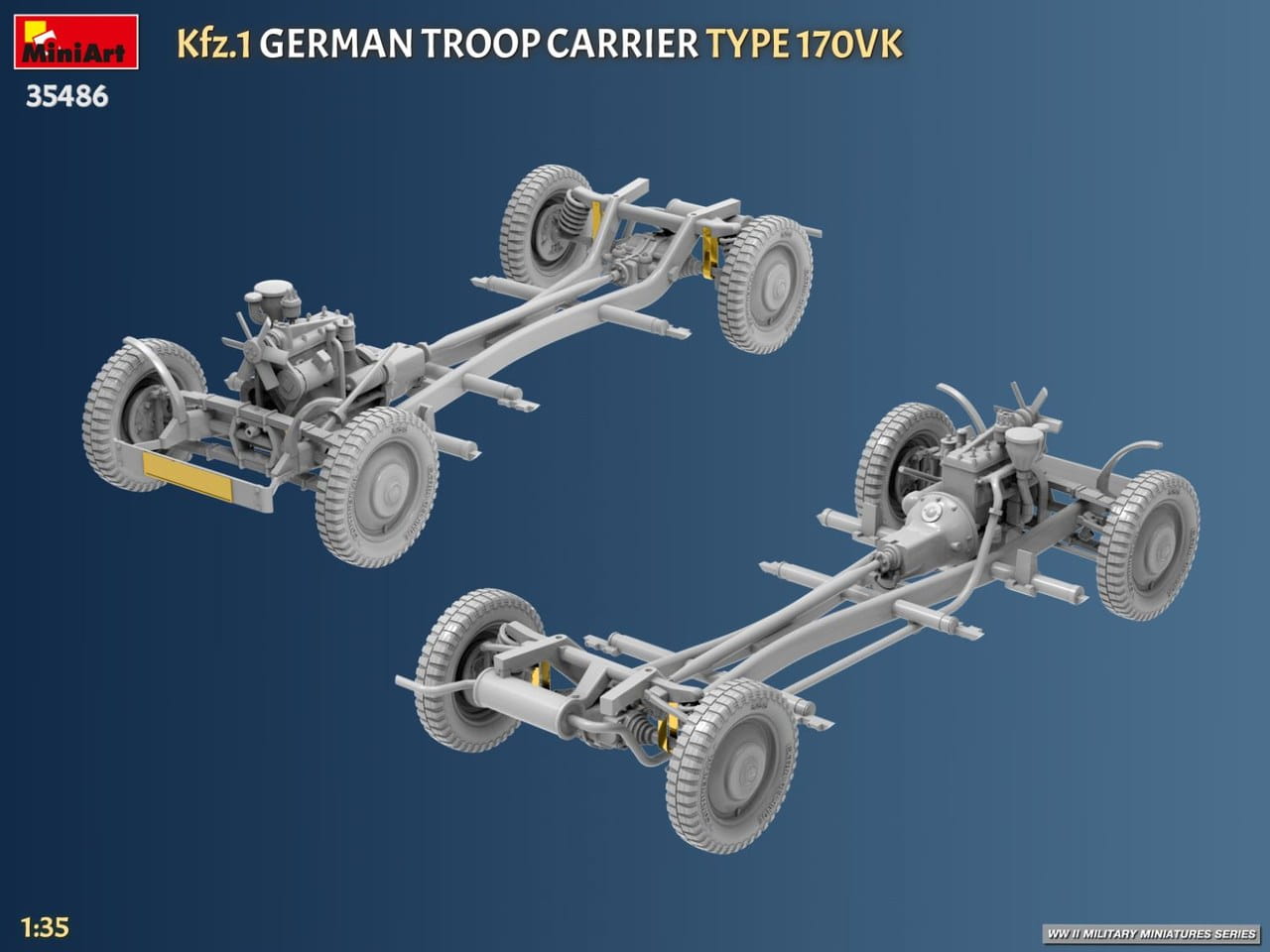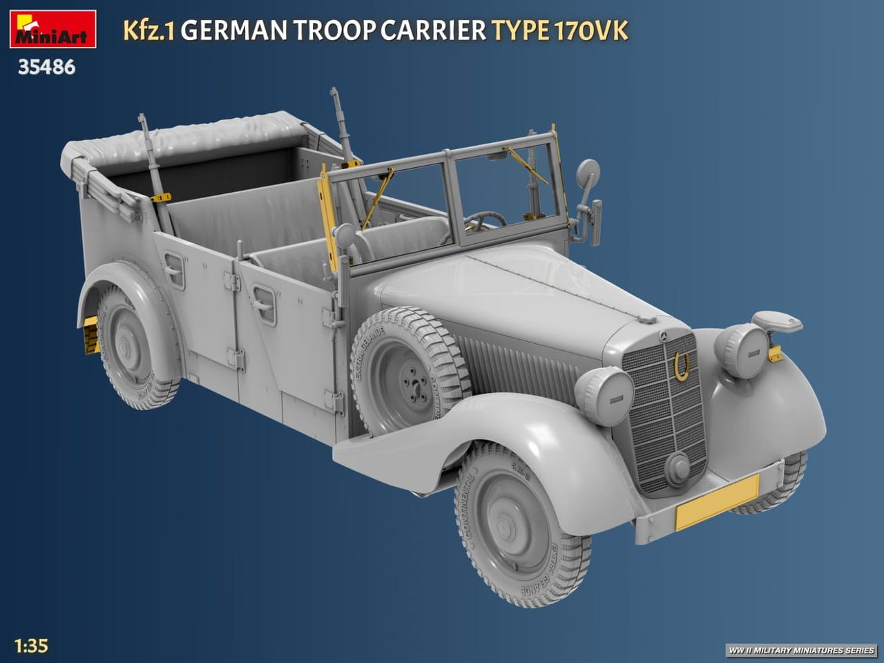 MiniArt 35486 to szczegółowy model plastikowy w skali 1:35 przedstawiający niemiecki lekki samochód transportowy Kfz.1 Type 170VK. Pojazdy tego typu były szeroko wykorzystywane przez Wehrmacht w pierwszych latach II wojny światowej jako środki transportu żołnierzy, oficerów oraz lekkiego wyposażenia.