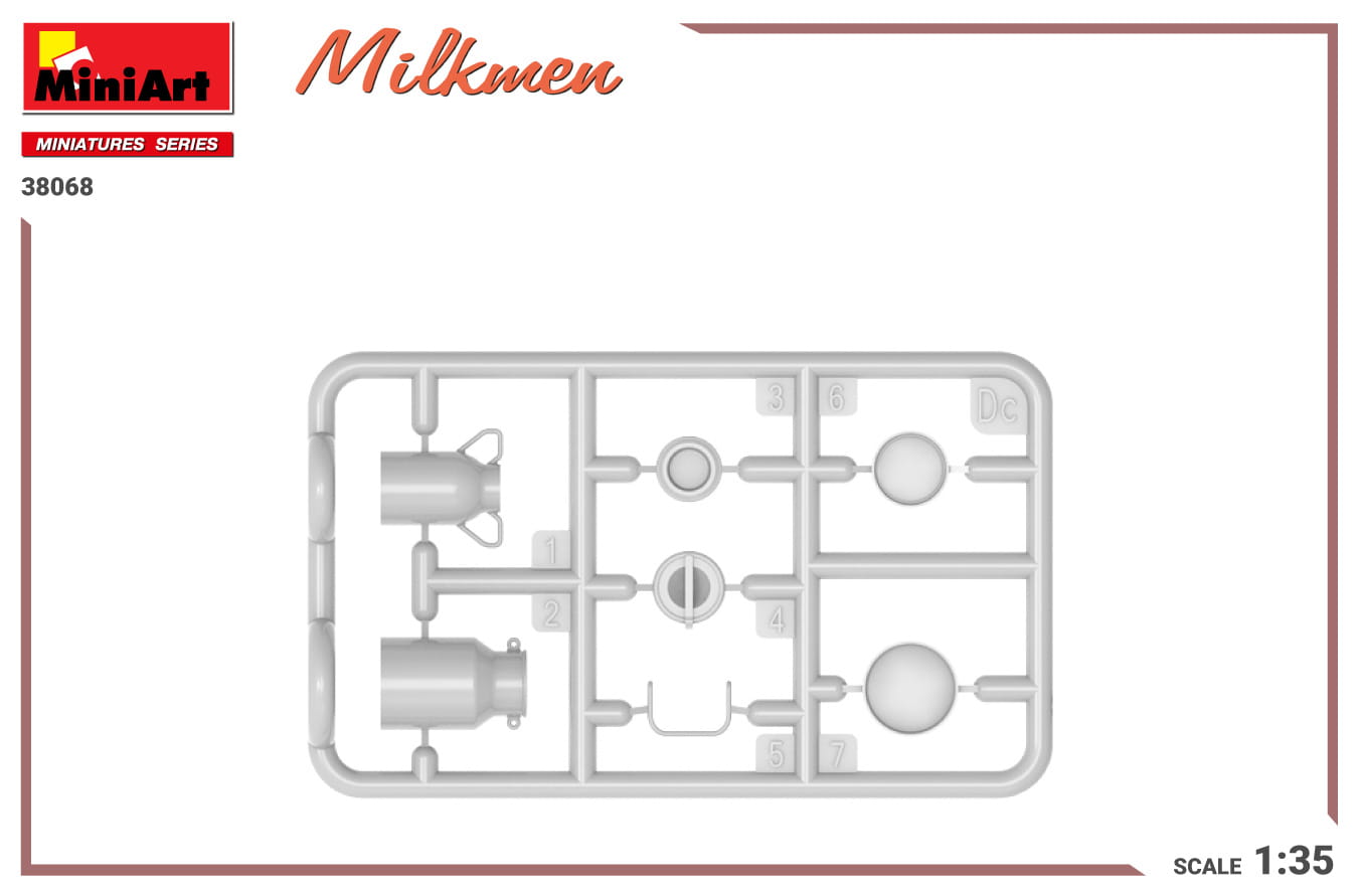 Zestaw 2 figurek plastikowych do sklejania postaci mleczarzy z dołączonymi bańkami i butelkami na mleko.