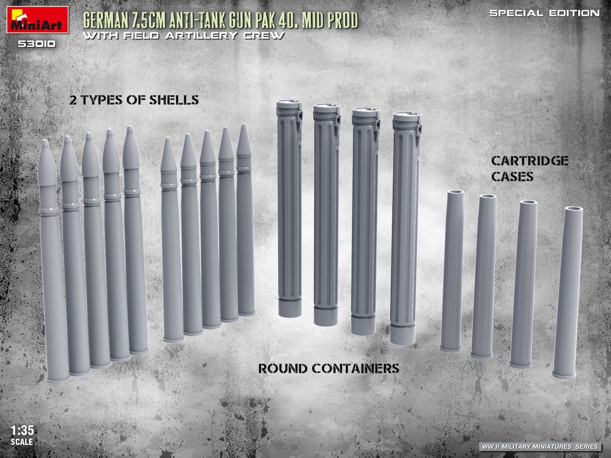 MiniArt 53010 to zestaw Special Edition przedstawiający jedną z najbardziej znanych niemieckich armat przeciwpancernych II wojny światowej – 7,5 cm PaK 40 w wersji produkcji środkowej. Model został opracowany z dużą dbałością o szczegóły, a dołączone figurki obsługi pozwalają na stworzenie dynamicznej sceny bojowej prosto po wyjęciu z pudełka.