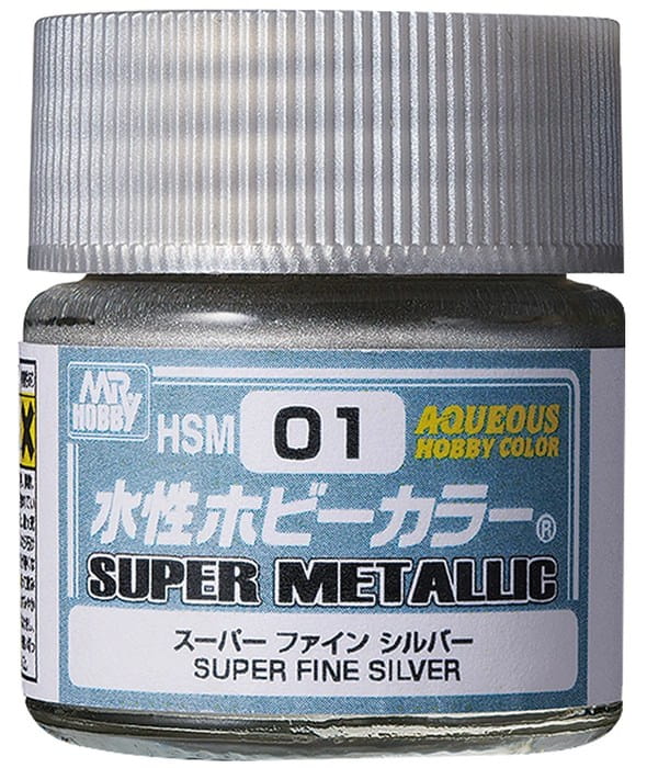 Metaliczna akrylowa farba na bazie wody do modeli plastikowych, japońskiej marki Mr.Hobby - kolor HSM01 Super Fine Silver Srebrny - opakowanie - szklany słoiczek z plastikową zakrętką