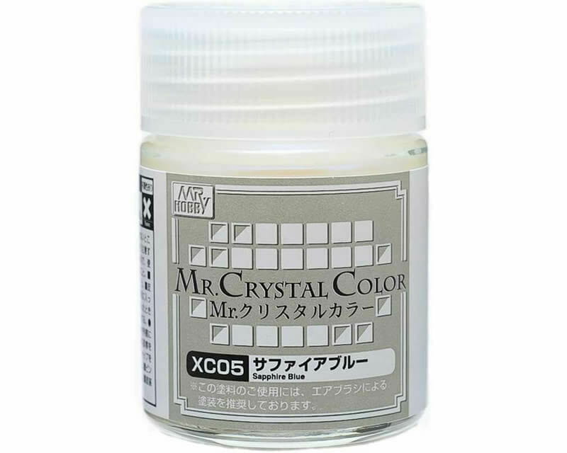 Mr.Hobby XC05 Sapphire Blue to perłowa farba modelarska, która oferuje niespotykany dotąd połysk i głębię koloru. Farba nie opiera się na własnej barwie, lecz zmienia wygląd w zależności od koloru podłoża oraz długości fali światła przechodzącego przez cząsteczki perły.
