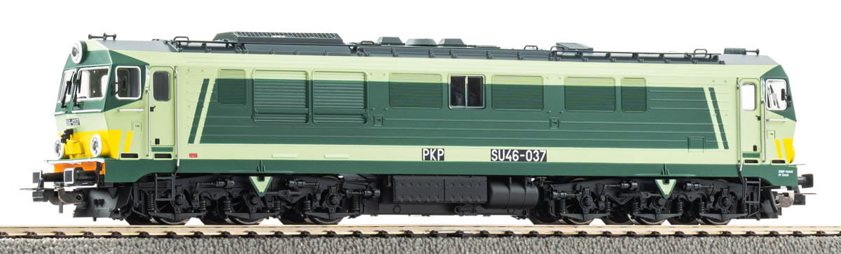 Model analogowy lokomotywy spalinowej SU46 w barwach PKP z epoki V. Wyposażony w oświetlenie LED i gniazdo dekodera NEM 658 – PluX22. Długość: 218 mm.