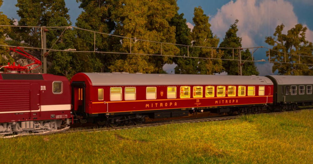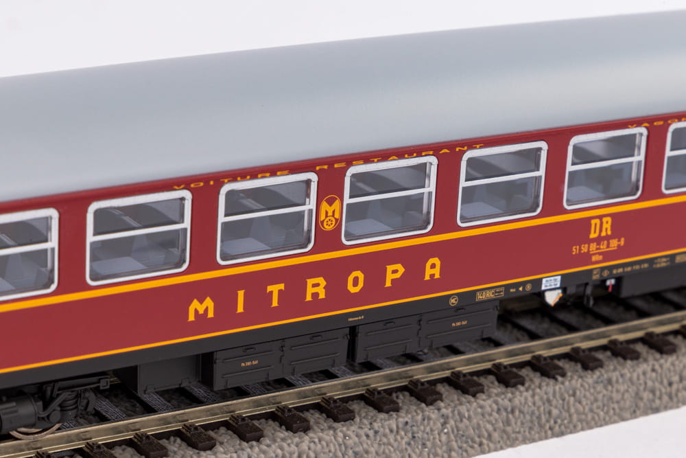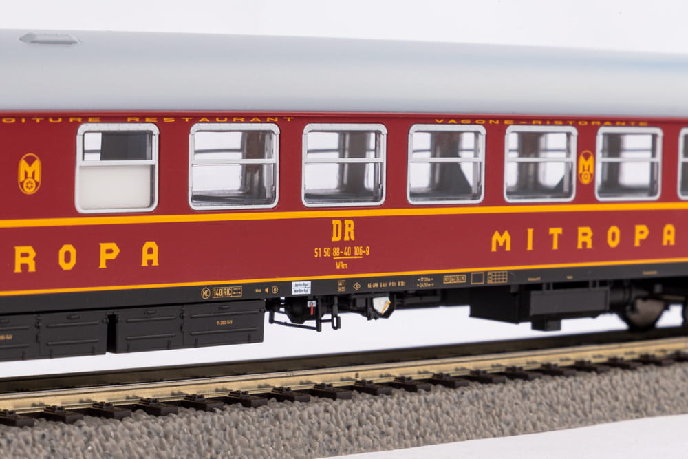 Model wagonu restauracyjnego WRm w malowaniu DR - Niemieckich Kolei Państwowych.