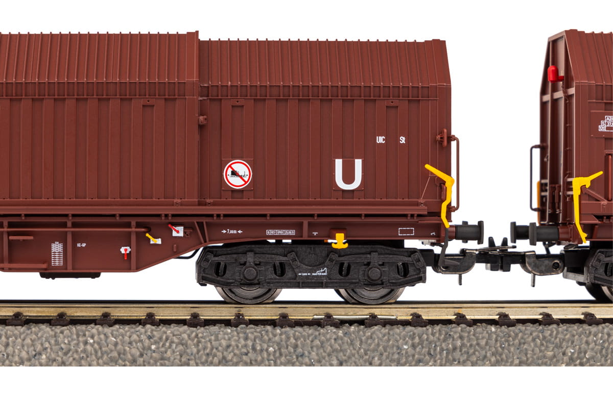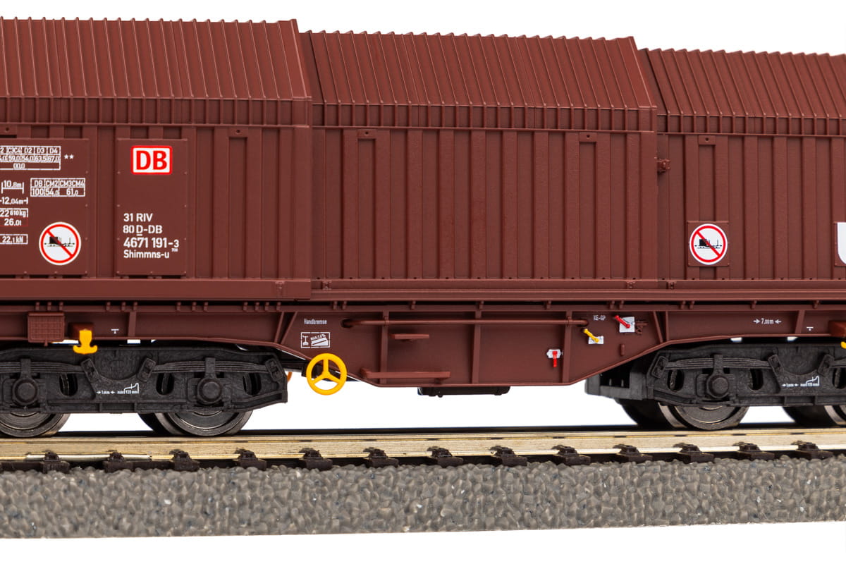 PIKO prezentuje zestaw dwóch teleskopowych wagonów towarowych w malowaniu DB Cargo z epoki VI. Modele odwzorowują wiernie swoje pierwowzory dzięki precyzyjnemu wykonaniu z tworzywa wtryskowego i licznym osobno montowanym detalom. Dopracowany układ jezdny i wysoka masa własna zapewniają znakomite właściwości toczne, a staranne malowanie i ostre nadruki nadają im realistyczny wygląd.