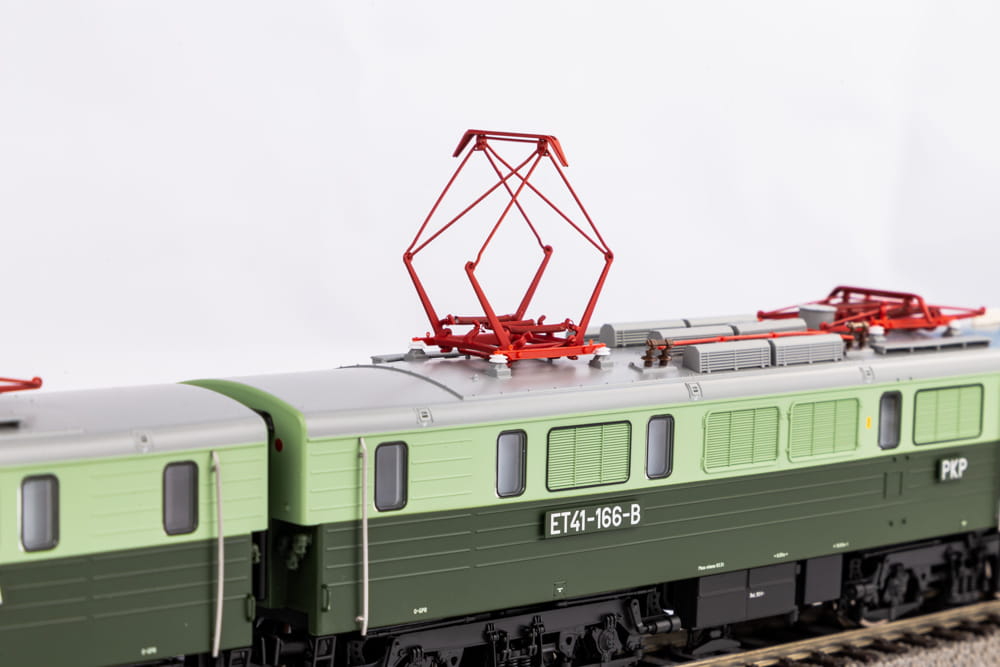 Wykonany z elementów plastikowych i metalowych model lokomotywy do kolejek elektrycznych w skali H0 czyli 1/87. Jest miniaturą elektrowozu ET41 u numerze własnym 166. Malowanie przedstawia lokomotywę używaną przez PKP - Polskie Koleje Państwowe z okresu epoki IV czyli z lat 1970 - 1990.