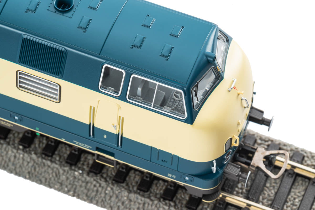Model lokomotywy spalinowej BR 221 w malowaniu DB epoki IV (niebiesko-beżowym)