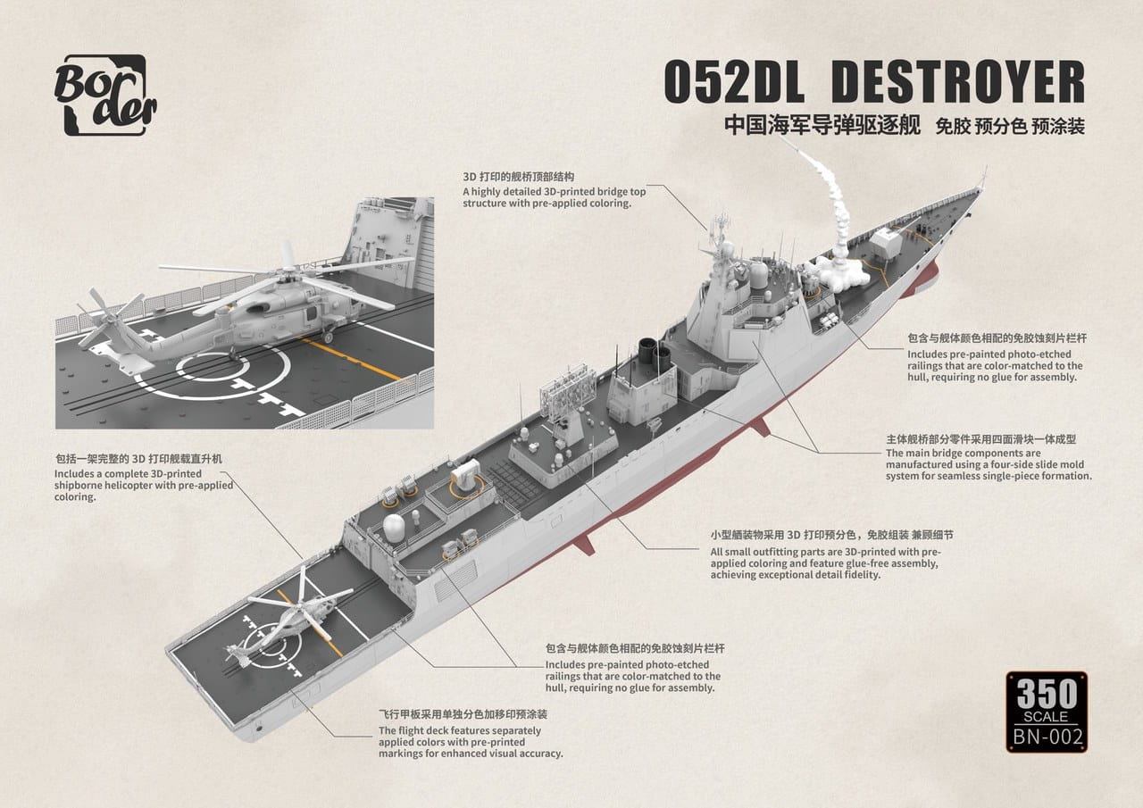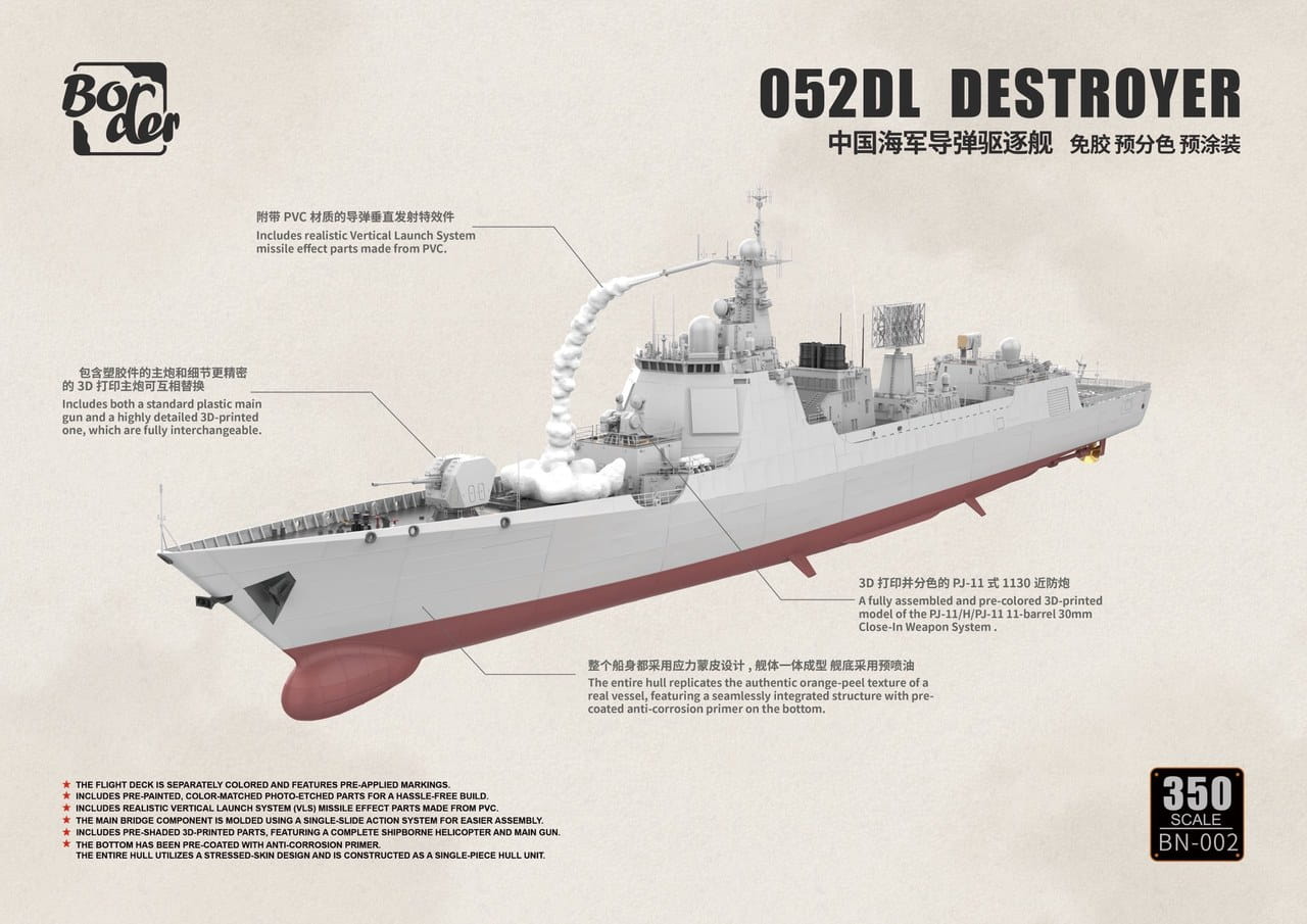 Border BN002 przedstawia nowoczesny chiński niszczyciel rakietowy Type 052DL w skali 1:350. Jednostki tej klasy stanowią ważny element współczesnych sił nawodnych People’s Liberation Army Navy (PLAN), pełniąc rolę wielozadaniowych okrętów obrony powietrznej i wsparcia zespołów floty.