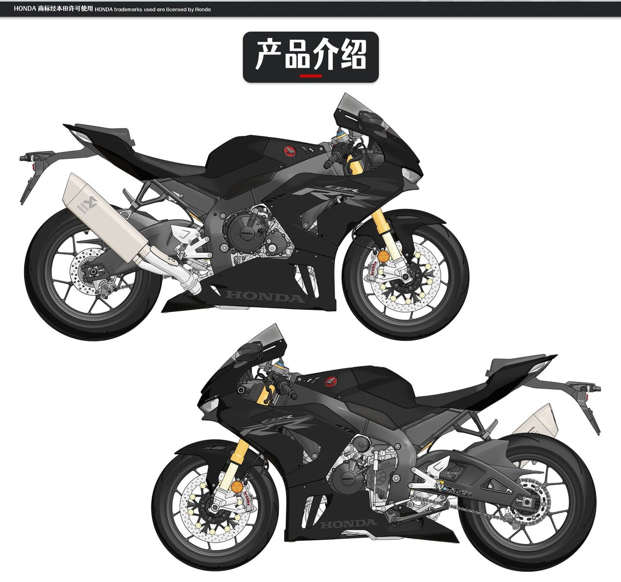 Zestaw przedstawia nowoczesny motocykl sportowy Honda CBR1000RR-R Fireblade SP w eleganckiej czarnej wersji kolorystycznej. Model firmy Magic Factory wyróżnia się bardzo wysokim poziomem detali oraz dokładnym odwzorowaniem konstrukcji, co pozwala na stworzenie realistycznej repliki tej zaawansowanej maszyny.