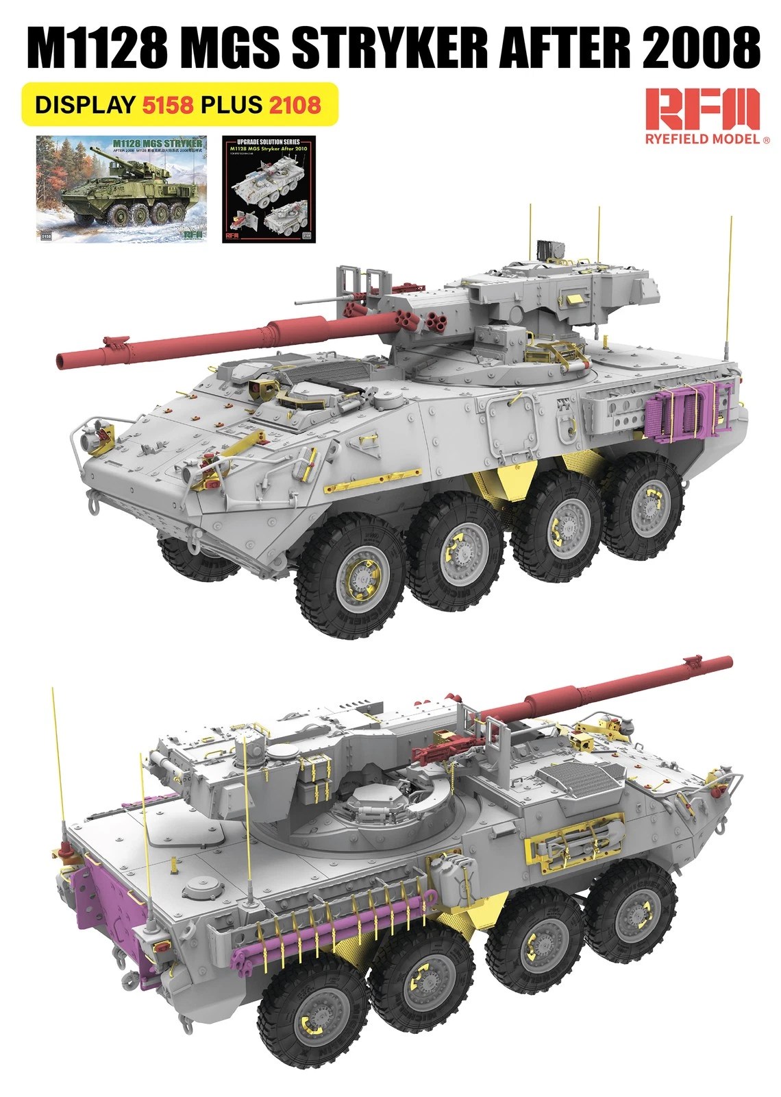 M1128 MGS (Mobile Gun System) Stryker to kołowy pojazd wsparcia ogniowego opracowany na bazie platformy Stryker, wykorzystywany przez siły zbrojne Stanów Zjednoczonych. Model firmy Rye Field Model w skali 1:35 przedstawia wersję po modernizacjach wprowadzonych po 2008 roku, oferując szczegółowe odwzorowanie kadłuba, wieży oraz uzbrojenia.