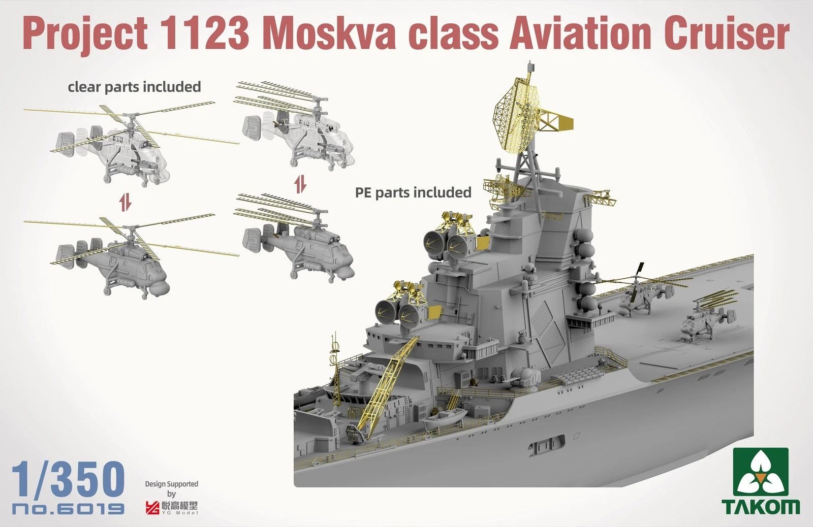Okręty projektu 1123 typu Moskwa były jednymi z pierwszych radzieckich jednostek przystosowanych do operowania śmigłowców pokładowych, przeznaczonych głównie do zwalczania okrętów podwodnych. Model firmy Takom w skali 1:350 pozwala na wykonanie szczegółowej repliki tej nietypowej konstrukcji, łączącej cechy krążownika rakietowego oraz nosiciela śmigłowców.