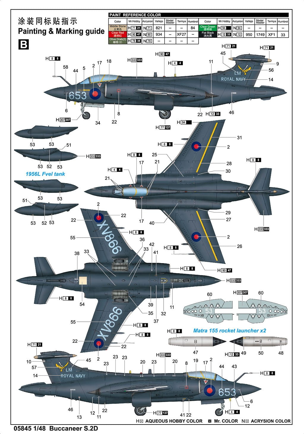 Trumpeter 05845 przedstawia Blackburn Buccaneer S.2D – brytyjski samolot uderzeniowy przeznaczony do operowania z lotniskowców Royal Navy. Maszyna została zaprojektowana do lotów na małej wysokości z dużą prędkością, aby skutecznie przełamywać obronę przeciwnika i atakować cele morskie oraz lądowe. Model w skali 1:48 umożliwia wykonanie efektownej miniatury tej charakterystycznej konstrukcji o masywnej sylwetce i składanych skrzydłach.