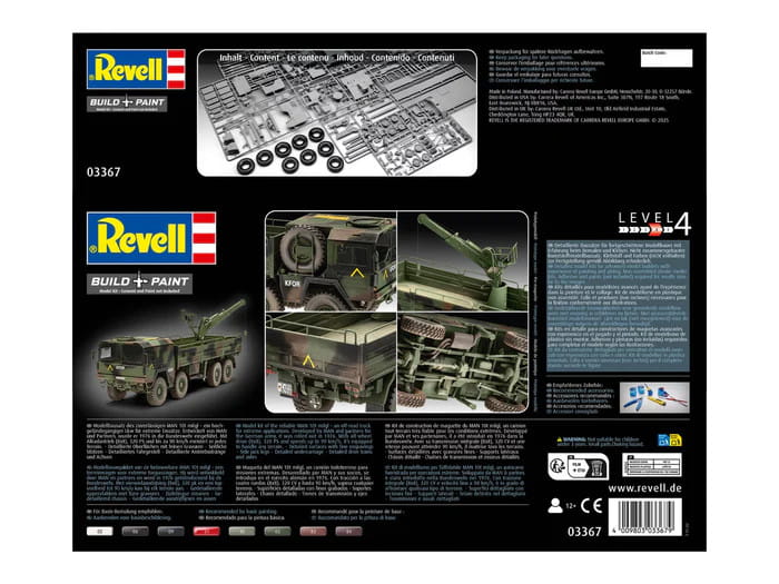 Revell 03367 to wysokiej jakości model plastikowy przedstawiający niemiecką wojskową ciężarówkę terenową MAN 10t milgl Truck 8x8. Pojazd ten był jednym z podstawowych środków transportowych Bundeswehry, charakteryzując się dużą ładownością, napędem na wszystkie osie oraz możliwością poruszania się w trudnym terenie.