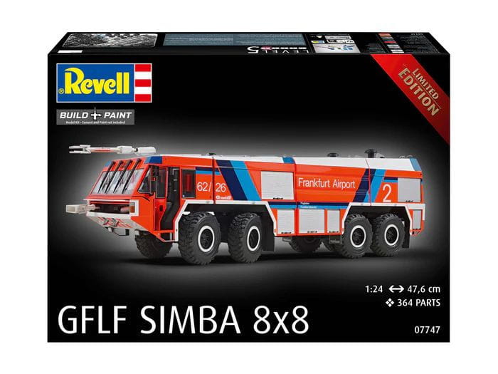 Revell 07747 przedstawia model ciężkiego wozu strażackiego GFLF Simba 8×8 w skali 1:24 w edycji limitowanej. Pojazd ten został zaprojektowany jako specjalistyczny samochód ratowniczo-gaśniczy przeznaczony do ochrony lotnisk i szybkiego reagowania w sytuacjach awaryjnych związanych z samolotami.