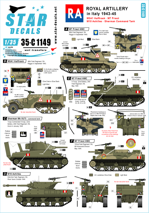 STAR DECALS 35-C1149 - 1:35 Royal Artillery in Italy. M7 Priest, M3 Halftrack, Sherman, M10 Achilles