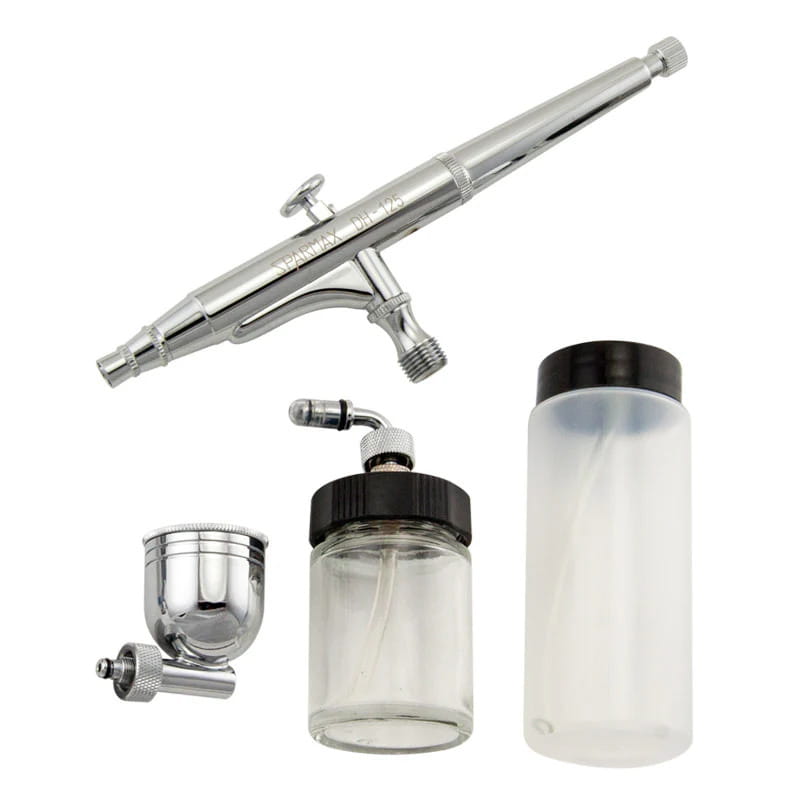 Wysokiej jakości dwuakcyjny aerograf z grawitacyjnym lub podciśnieniowym podawaniem farby, wymiennymi zbiorniczkami na farbę, dyszą 0,5mm oraz regulacją welkości plamki.
