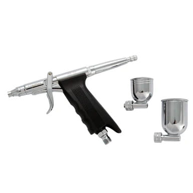 Wysokiej jakości dwuakcyjny aerograf pistoletowy z grawitacyjnym podawaniem farby, dyszą 0,5mm oraz regulacją welkości plamki.