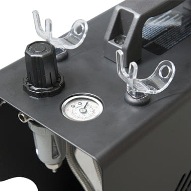 TC610H PLUS to nieduży kompresor zapewniający stabilne źródło powietrza do aerografu wraz z szerokim zakresem regulacji ciśnienia roboczego. Kompresor jest cichy, więc można go używać w mieszkaniu. Zintegrowany z regulatorem ciśnienia filtr i odwadniacz zapewnia skuteczne osuszanie powietrza, które trafi do aerografu. Urządzenie posiada 2,5 litrowy zbiornik powietrza, które skraca czas pracy urządzenia wydłużając jego żywotność. Dodatkowo możliwa jest praca, jeśli zbiornik jest napełniony, a kompresor wyłączony - aż do zużycia całego zgromadzonego powietrza. Kompresor jest wyposażony w automatyczny wyłącznik ciśnieniowy, który wyłącza urządzenie po osiągnięciu około 4 barów ciśnienia w zbiorniku powietrza i włącza go, gdy to ciśnienia spadnie do 2,7 bara. Dodatkowo kompresor posiada zabezpieczenie przed przegrzaniem. Urządzenie posiada dwa wyjścia powietrza - każde na standardowy gwint 1/8", co umożliwia podłączenie dwóch aerografów naraz za pomocą dwóch wężyków. W celu podpięcia drugiego aerografu należy najpierw odkręcić zaślepkę z drugiego wyjścia. Sztywna, metalowa obudowa posiada wygodną rączkę do przenoszenia urządzenia, a także ułatwia wpasowanie i ustawienie go w warsztacie lub mieszkaniu zapewniając ochronę wszystkich podzespołów. Posiada także dwa wieszaki na aerografy na górnej płycie obudowy. Do kompresora dołączony jest wężyk o długości 3m, a także 3 przejściówki do aerografów z gwintów Paasche, Badger i Aztek na gwint 1/8".