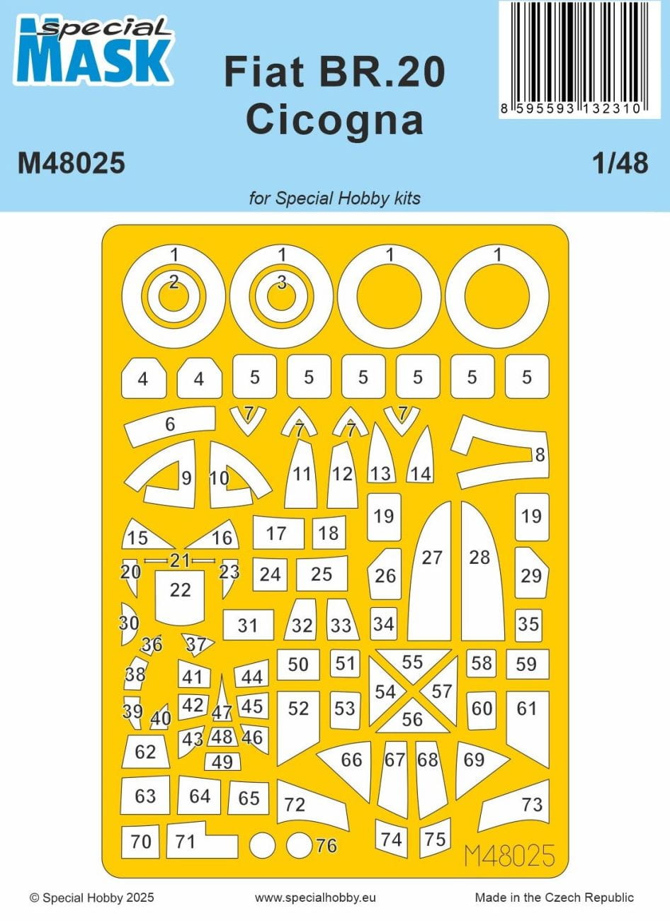 Zestaw precyzyjnie wyciętych masek do malowania modelu włoskiego bombowca Fiat BR.20 Cicogna w skali 1:48, opracowany z myślą o zestawie Special Hobby. Maski pozwalają w łatwy sposób zabezpieczyć przezroczyste elementy kabiny oraz koła przed malowaniem, co zapewnia estetyczne, ostre krawędzie bez ryzyka podcieków farby.