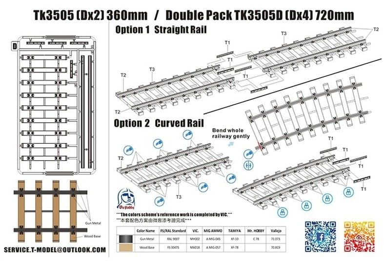 Zestaw T-Model TK3505D przedstawia fragment torowiska kolejowego o europejskim rozstawie 720 mm, obejmujący zarówno odcinki proste, jak i łukowe. Jest to doskonały dodatek do dioram przedstawiających transport kolejowy, szczególnie w kontekście wojskowym lub przemysłowym.