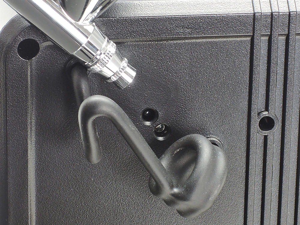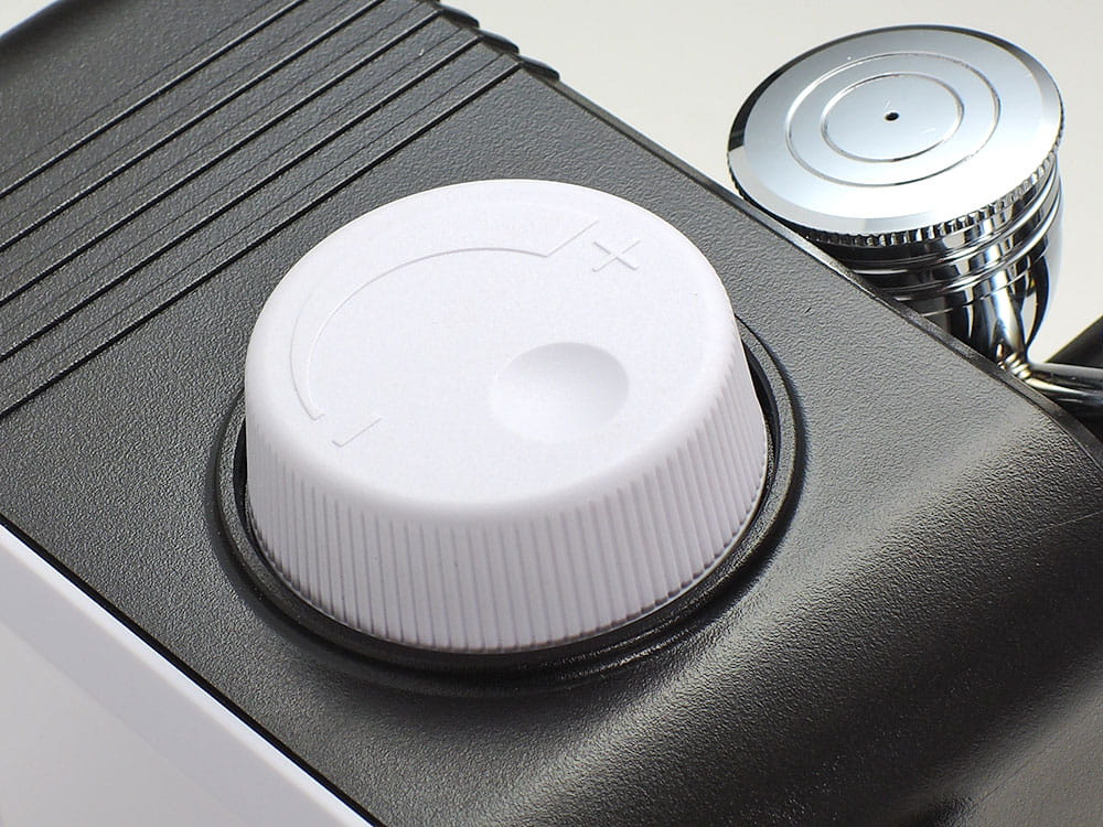 Mini kompresor do zasilania aerografów. Cechy i dane techniczne : Waga 0.6 kg, wymiary 12.5 x 7.0 x 11.5 cm, pobór mocy 24W, poziom hałasu 45dB, płynna regulacja ciśnienia przy pomocy pokrętła, system start-stop ( kompresor wyłącza się i włącza automatycznie przy odkładaniu i podnoszeniu aerografu) W zestawie: kompresor wraz z zasilaczem oraz wąż przyłącza powietrza (1/8 cala) Zestaw nie zawiera widocznego na zdjęciu aerografu.