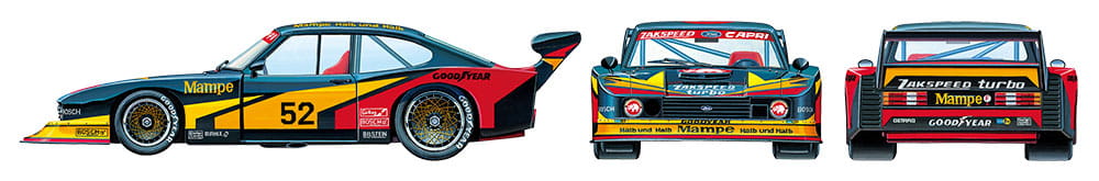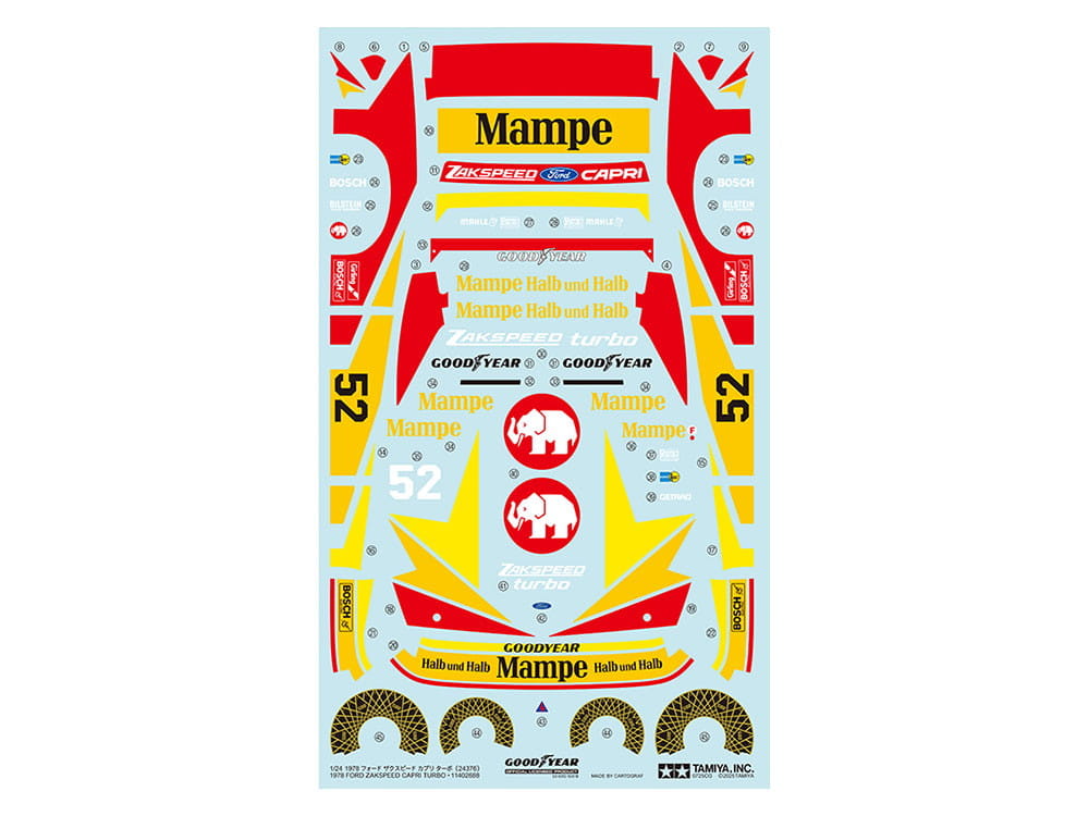 Tamiya 24376 przedstawia Forda Zakspeed Capri Turbo – jeden z najbardziej spektakularnych samochodów wyścigowych końca lat 70. XX wieku. Samochód powstał na bazie popularnego Forda Capri, jednak został gruntownie przebudowany przez niemiecki zespół Zakspeed specjalnie do startów w serii DRM (Deutsche Rennsport Meisterschaft).