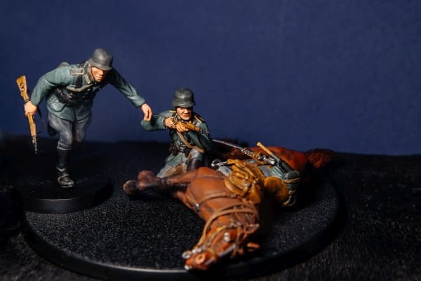Zestaw figurek żywicznych do sklejania niemieckich kawalerzystów z okresu drugiej wojny światowej.