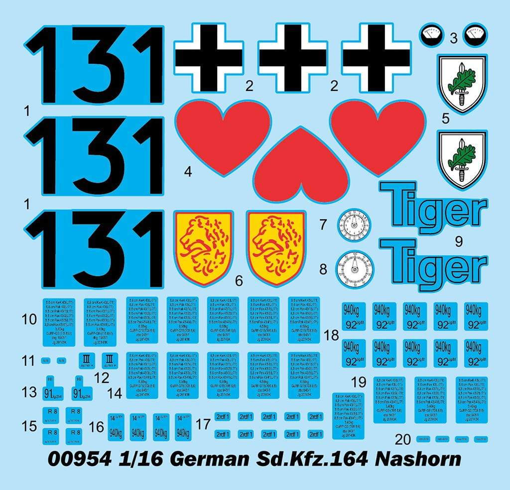 Trumpeter 00954 przedstawia niemiecki niszczyciel czołgów Sd.Kfz.164 Nashorn w imponującej skali 1:16. Pojazd ten został opracowany jako mobilna platforma dla potężnej armaty przeciwpancernej 8,8 cm PaK 43, zdolnej do zwalczania ciężko opancerzonych czołgów przeciwnika na dużych dystansach. Duża skala pozwala na bardzo szczegółowe odwzorowanie konstrukcji oraz detali uzbrojenia i przedziału bojowego.